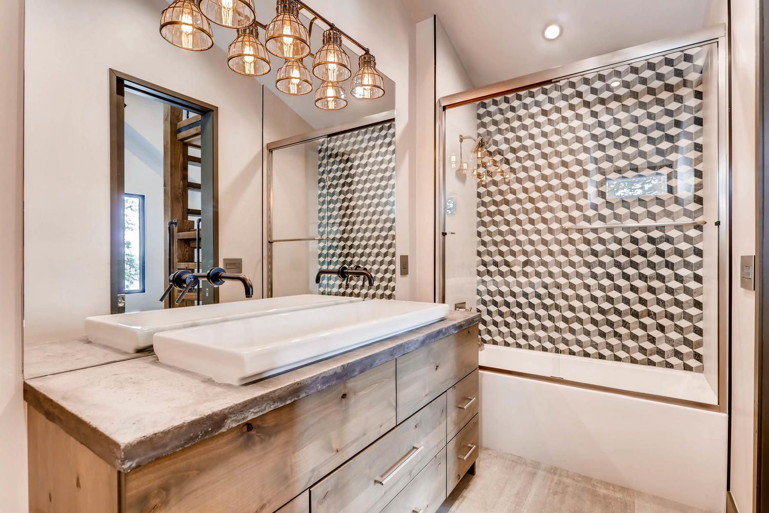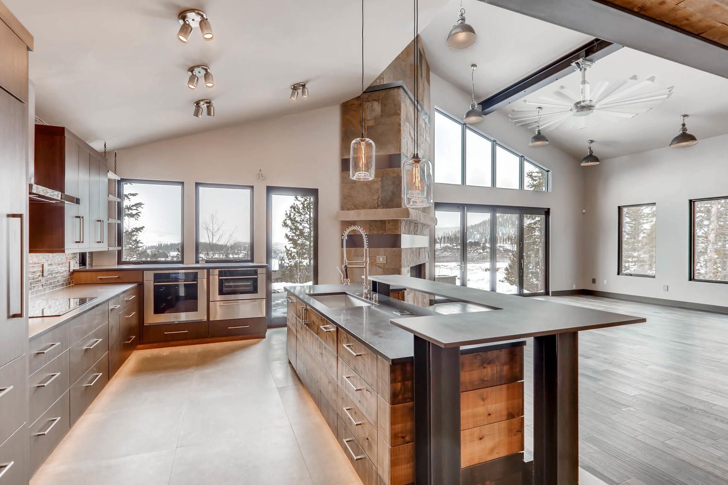 For this stunning home overlooking the golf course we took a new approach. We decided to use contemporary stylings with industrial/loft and mountain flare. The living room windows slide all the way open to present an uninterrupted view of the mountains as well as the golf course below (with horse drawn sleigh ride in winter months). Steel beams, glass and clean lines lend to the modern style while wood and tile keep it warm and inviting. The kitchen features an induction cooktop and all you could desire for a gourmet experience. All elements of this home were selected by Double Diamond without the use of an interior designer.