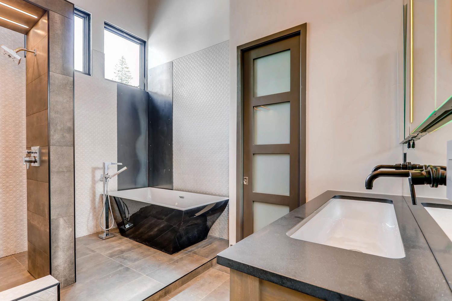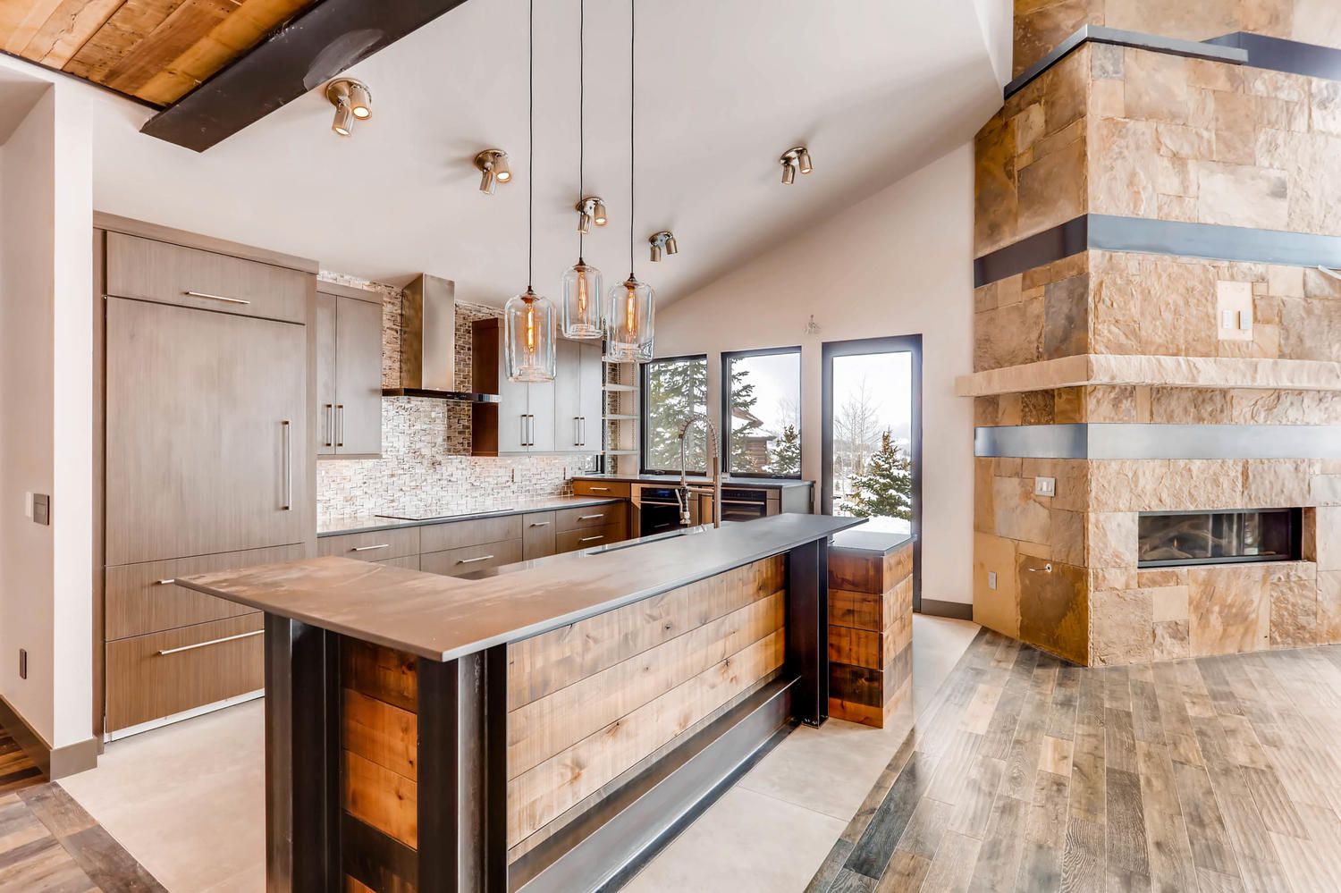 This home was built in town with other homes surrounding it. The biggest challenge we faced was to maximize the amazing view of the ski mountain while minimizing the view of the adjoining properties. After numerous site visits and working closely with the architect we were able to obtain excellent views. Using glass block as a kitchen wall we were able to bring light in without being able to see the closest neighboring home. Some of the unique features included in this home is a water feature located near the front door of the home on both the interior and exterior. The exterior feature creates the sensation of a small creek running through your front yard. Inside the home humidity is provided along with the soothing sound of flowing water. Inlaid copper details were added to the trim material to add a unique presence. In the back yard of the home, the placement of a stamped, heated concrete patio with a fire pit and sunken hot tub provides a relaxing area to sit and enjoy the views.